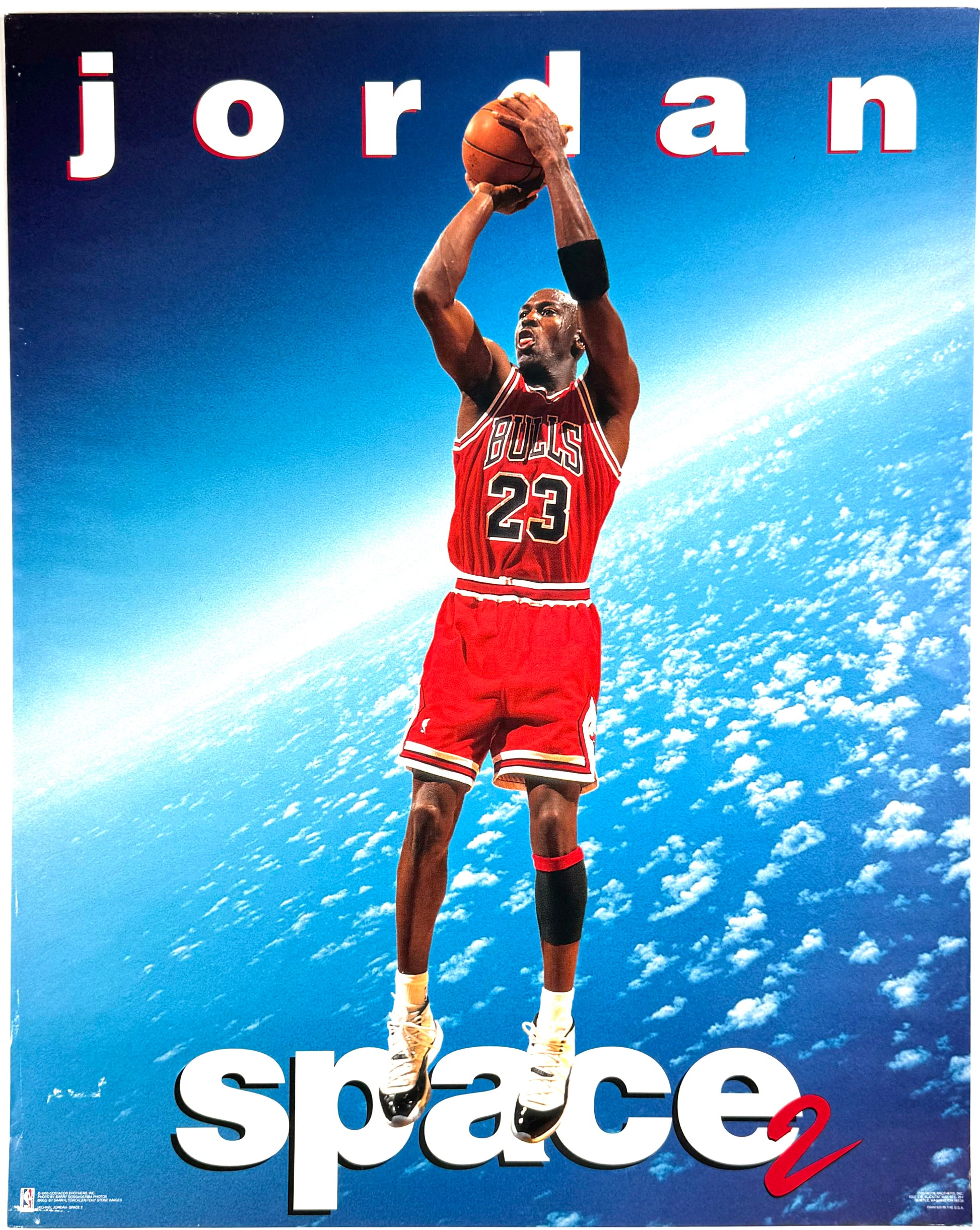 This iconic poster from 1995 captures the legendary Michael Jordan mid-air, executing one of his signature dunks against a stunning blue sky backdrop. The imagery evokes the height of Jordan’s career, symbolizing his unparalleled athleticism and grace.