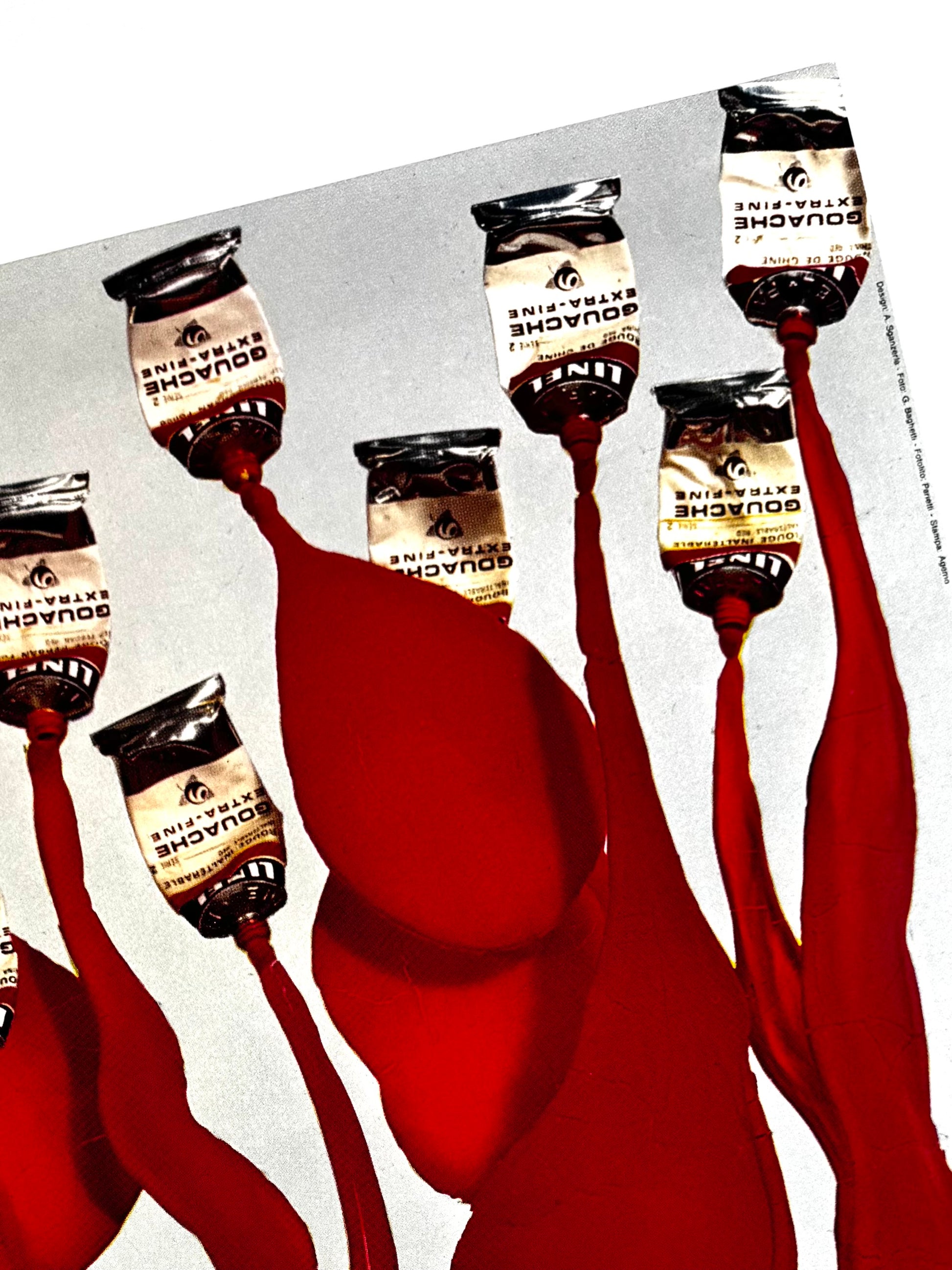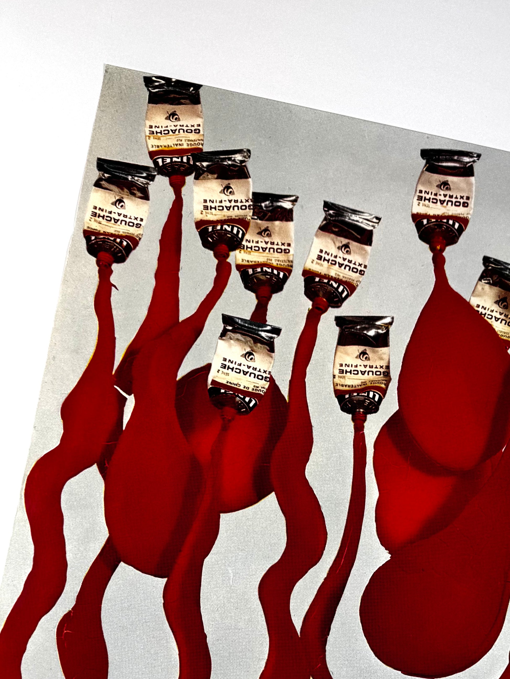The image features multiple upside-down Leningrad gouache paint tubes, each releasing long, flowing streams of thick red paint.