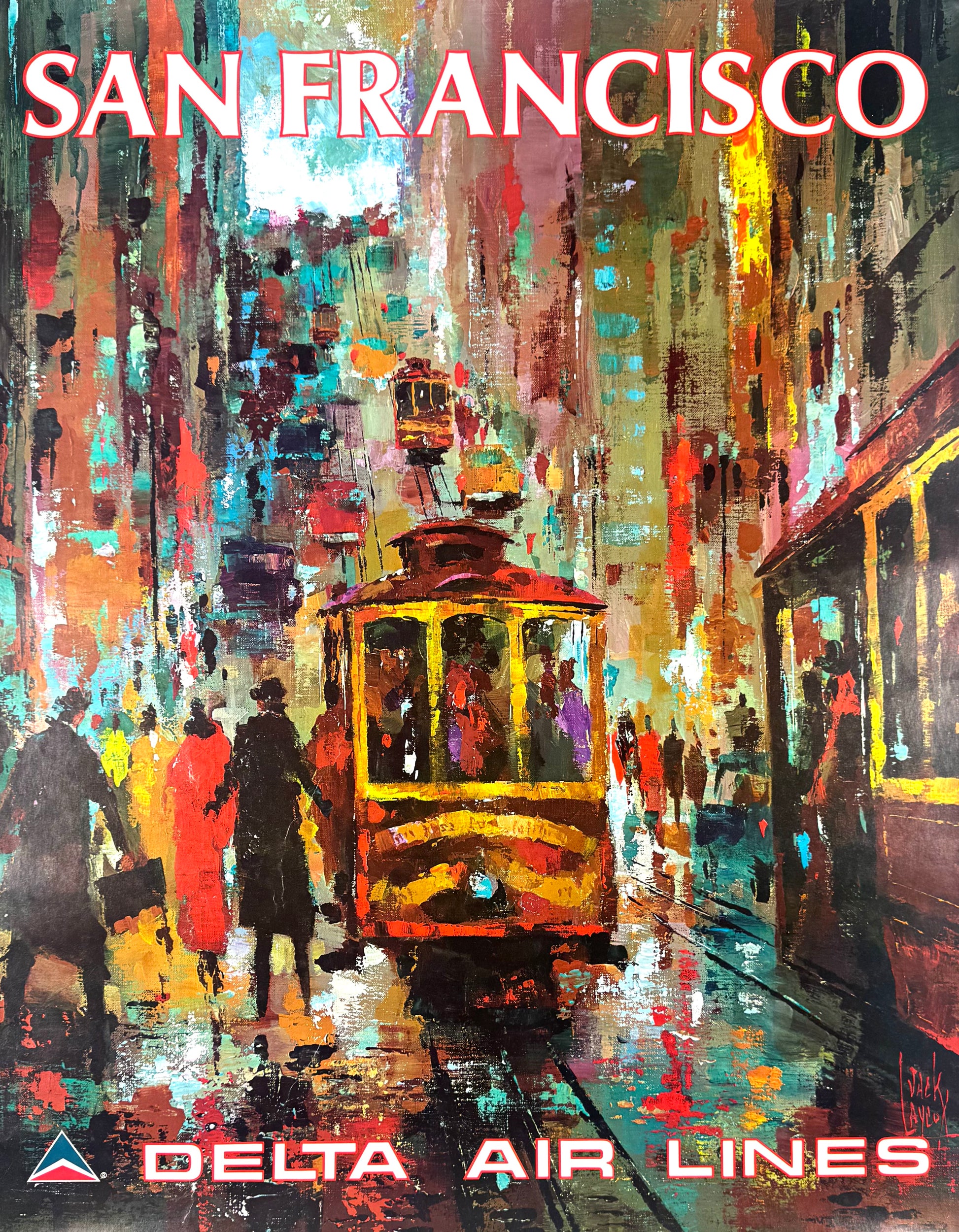 This original vintage Delta Air Lines San Francisco poster, designed by American artist Jack Laycox in 1970, is a striking celebration of both travel and mid-century design. With its incredible color palette and bold composition, the poster captures the spirit of San Francisco during the golden era of airline advertising.